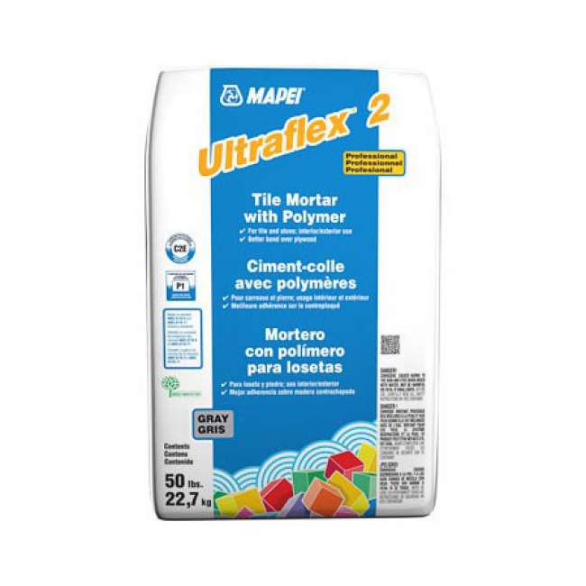 Mapei Ultraflex 2 (gray) is a professional-grade, single-component, high-performance, polymer-modified thin-set mortar for interior and exterior installations of ceramic, porcelain and dimensional natural-stone tile. This mortar has a high content of unique dry polymer, resulting in excellent adhesion to the substrate and tile. Ultraflex 2 meets or exceeds ANSI A118.4 and ANSI A118.11 requirements when mixed with water. Ultraflex 2 can be used for interior and exterior installations of tile in most residential floor and wall applications. In commercial applications, use on interior floor and wall installations and exterior floors.