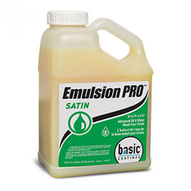 Basic Coatings Emulsion PRO Advanced Oil and Water Wood Floor Finish & Sealer (satin finish): As a breakthrough in value, Emulsion PRO has what so many waterbased coatings don't - the warm, rich, amber tones of an oil-based finish. Emulsion PRO is self-sealing, VOC compliant and has an oxidative cross-linked urethane system that produces better wear properties than traditional oil finishes. Emulsion PRO is a professional grade self-sealing, low foam, dual crosslinking polyurethane system designed for use in a variety of wood floor applications. Emulsion PRO adds a rich amber color, much like an oil, with fast dry times and superior application properties.