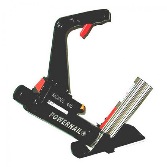 The Powernail 445 LS Pneumatic Tongue and Groove Flooring Stapler mallet activated pneumatic nailer brings Powernail quality to a pneumatic nailer. For those looking for the ease-of-use of a pneumatic stapler tool, the Powernail Pneumatic Tongue and Groove Flooring Stapler 445 LS is designed to be uses with 1-1/2", 1-3/4" and 2" Powercleat nails - providing several distinct advantages. Like the model Powernail Pneumatic Stapler 45, the Powernail 445 LS T&G can nail 1/2", 3/4", and 33/32" tongue and groove hardwood flooring through the use of easy-to-change adapter plates. Just snug the boards together with the mallet, tap the plunger on top of the Nailer with the mallet and let the Powernailer Stapler 445 LS drive the nail at the correct 45-degree angle and set the nail. The Model 445 LS has a safety trigger & interlocking safety mechanism to prevent discharging when not in nailing position or upon dropping the nailer on the plunger.
